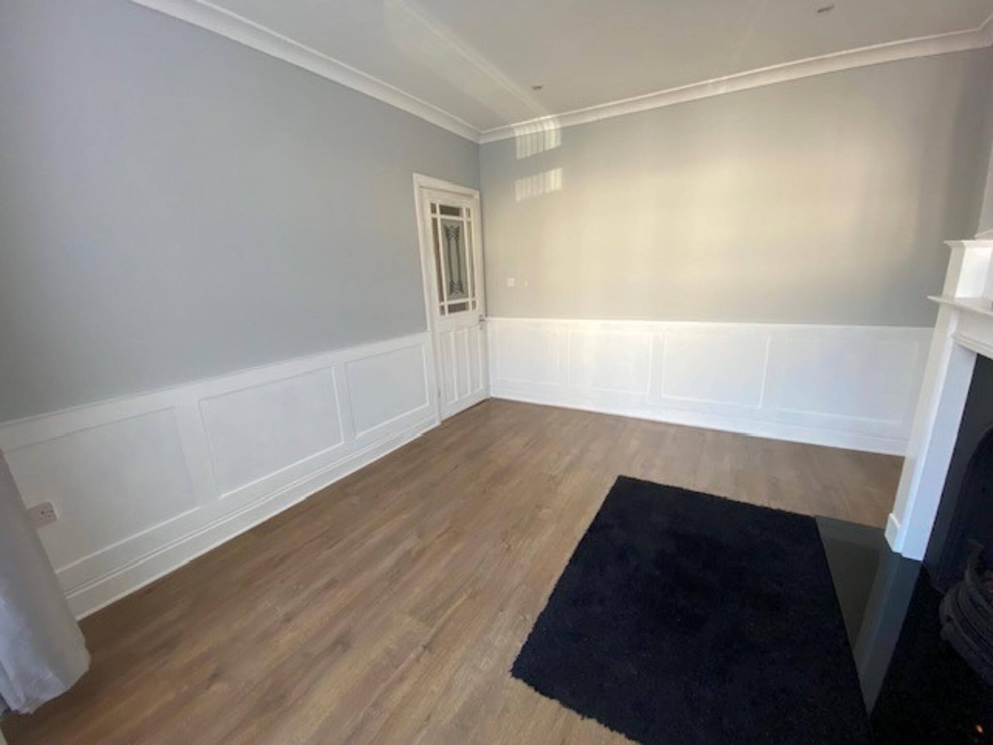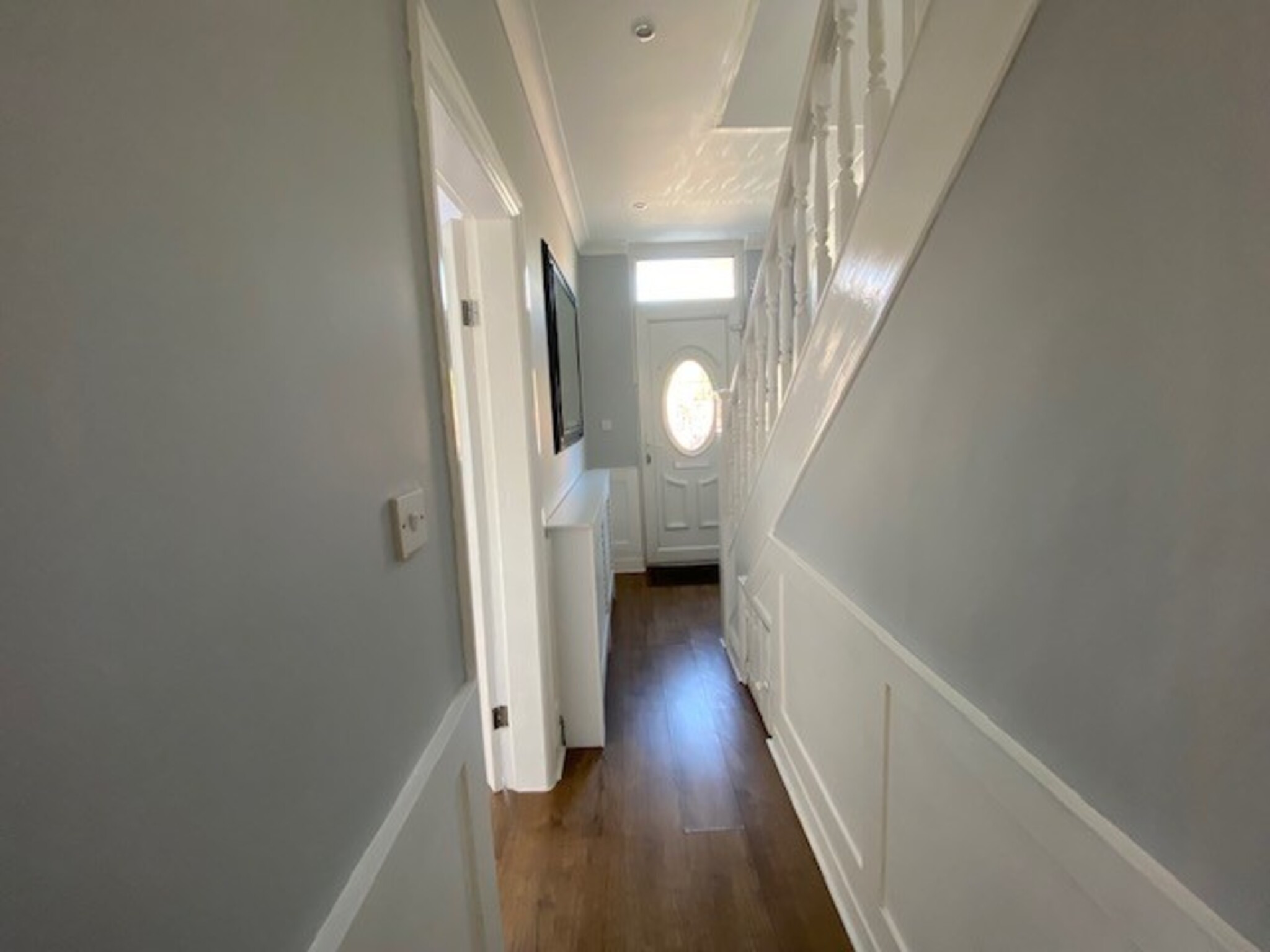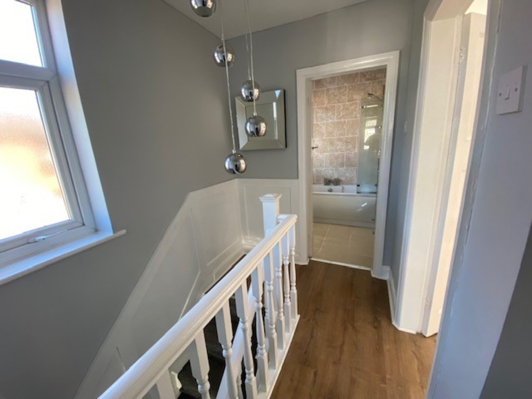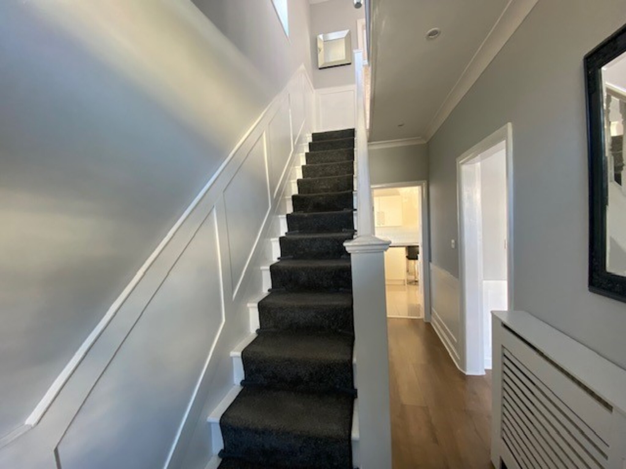 Wall dado panelling, laminate flooring, radiator with radiator cover, carpeted stairs, leading to the landing with laminate flooring.