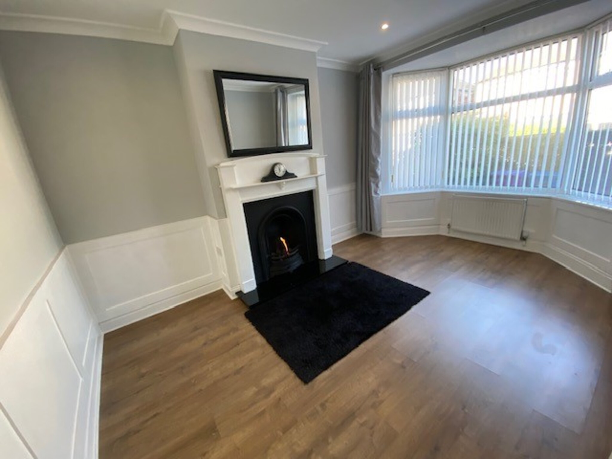 Bay window dressed with blinds, part wall panelling, laminate flooring, radiator.