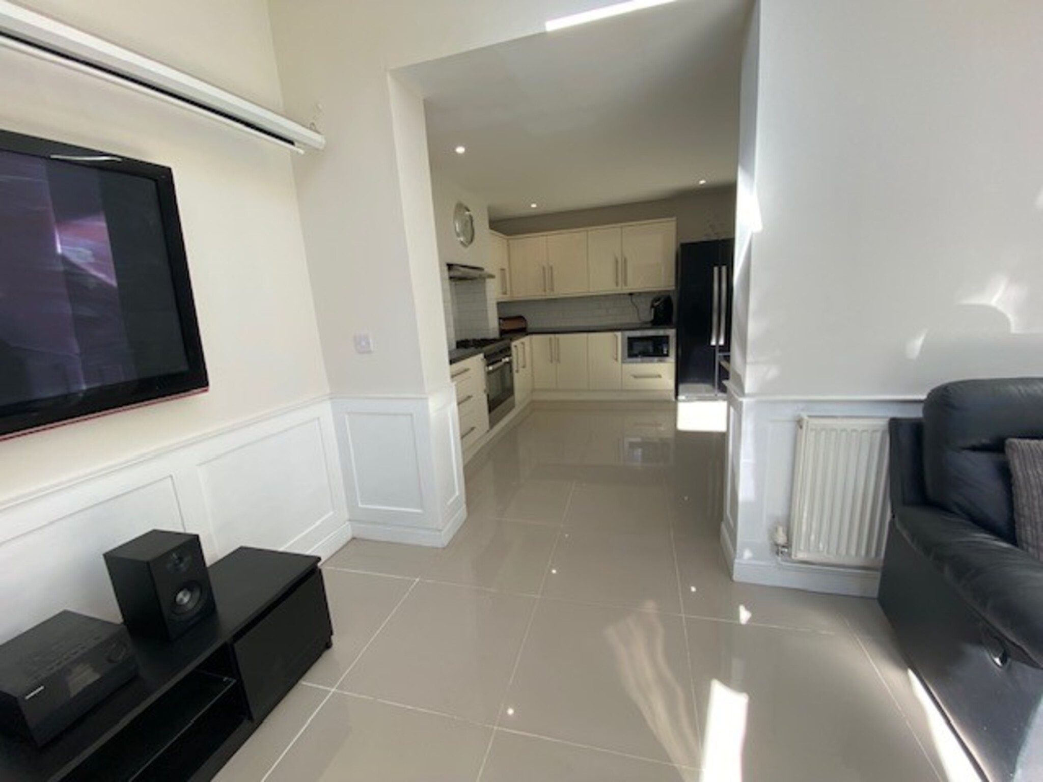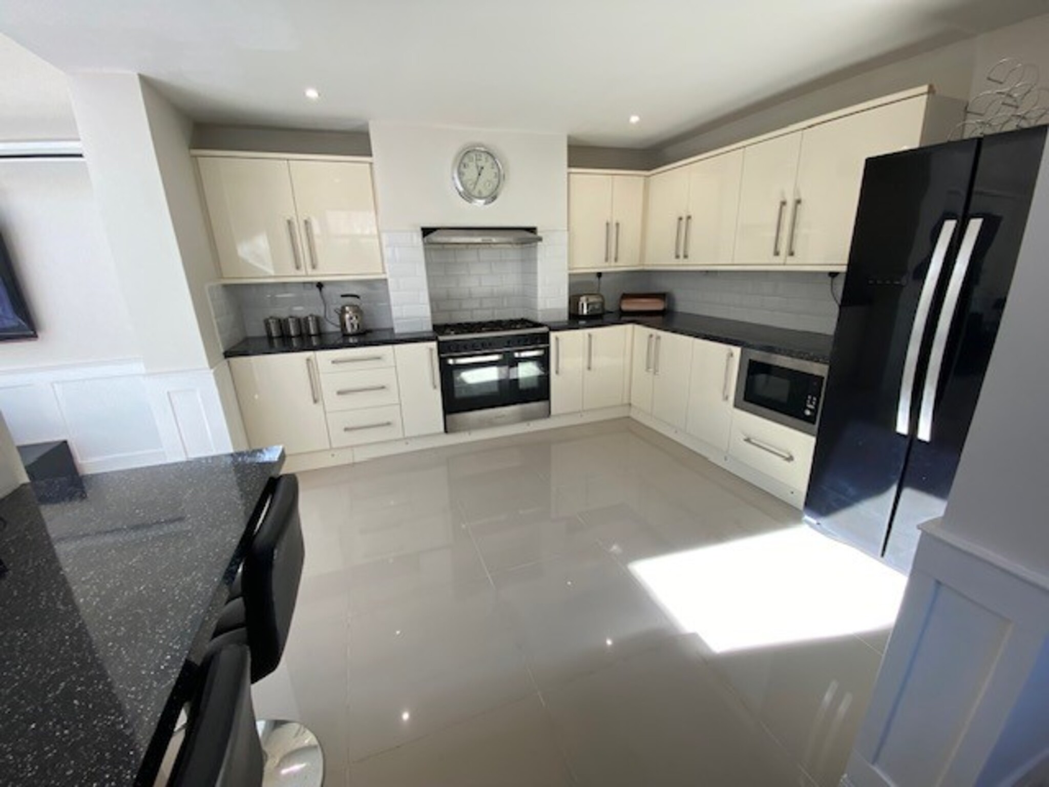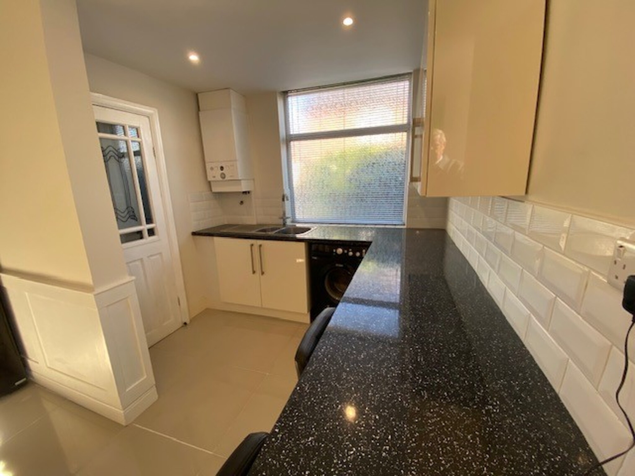 Range of fitted wall and base units with free standing range, extractor fan, 1 ½ drainer sink, feature lights to base unit plinths, part tiled walls, tiled flooring, radiator. Leading to :