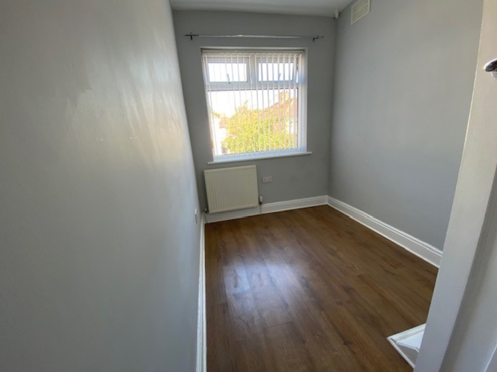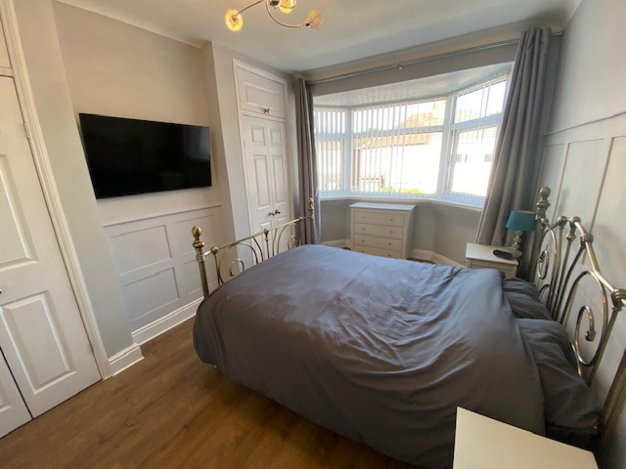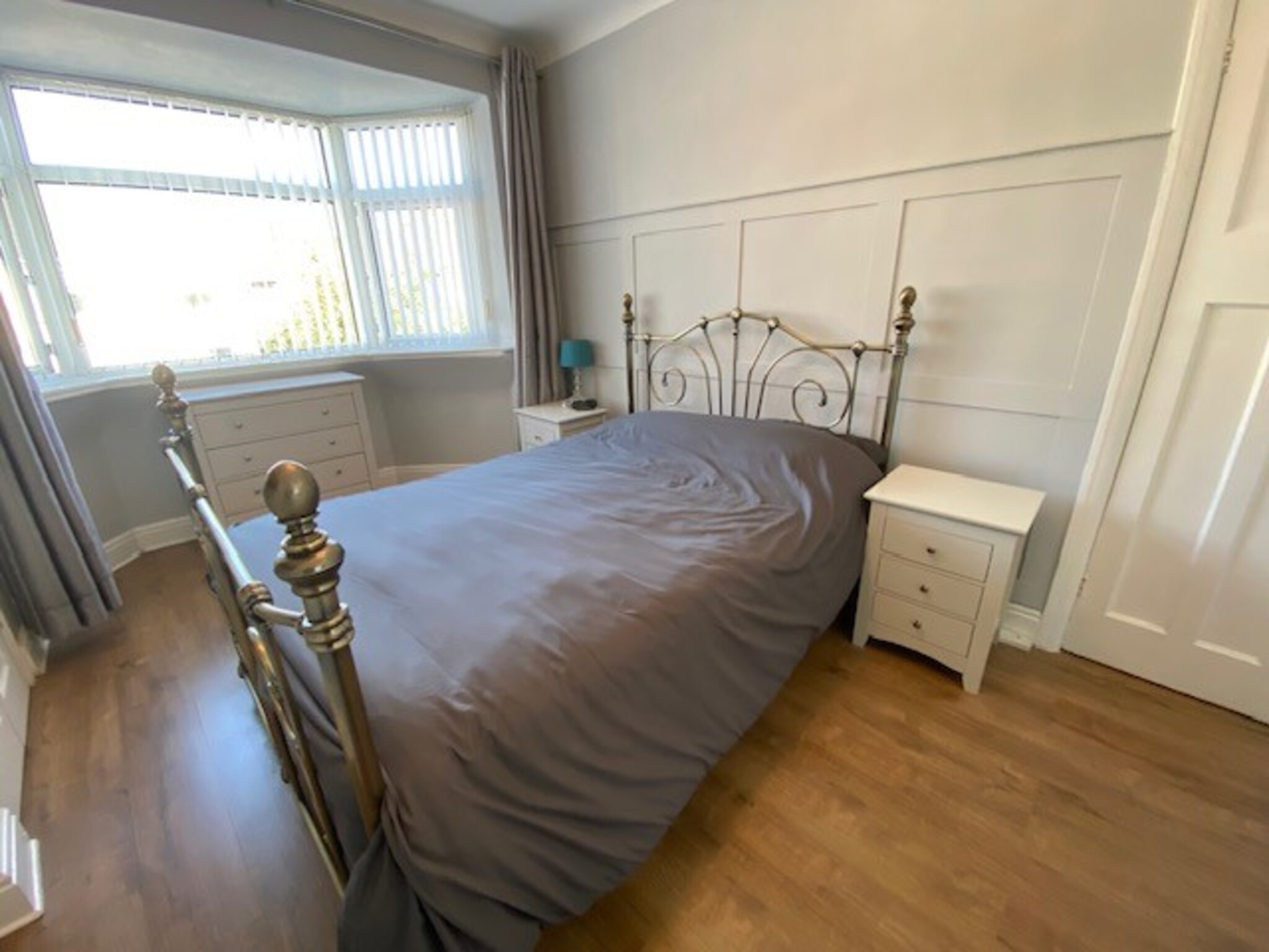 Bay window dressed with blinds, built in wardrobes. part wall panelling, laminate flooring.