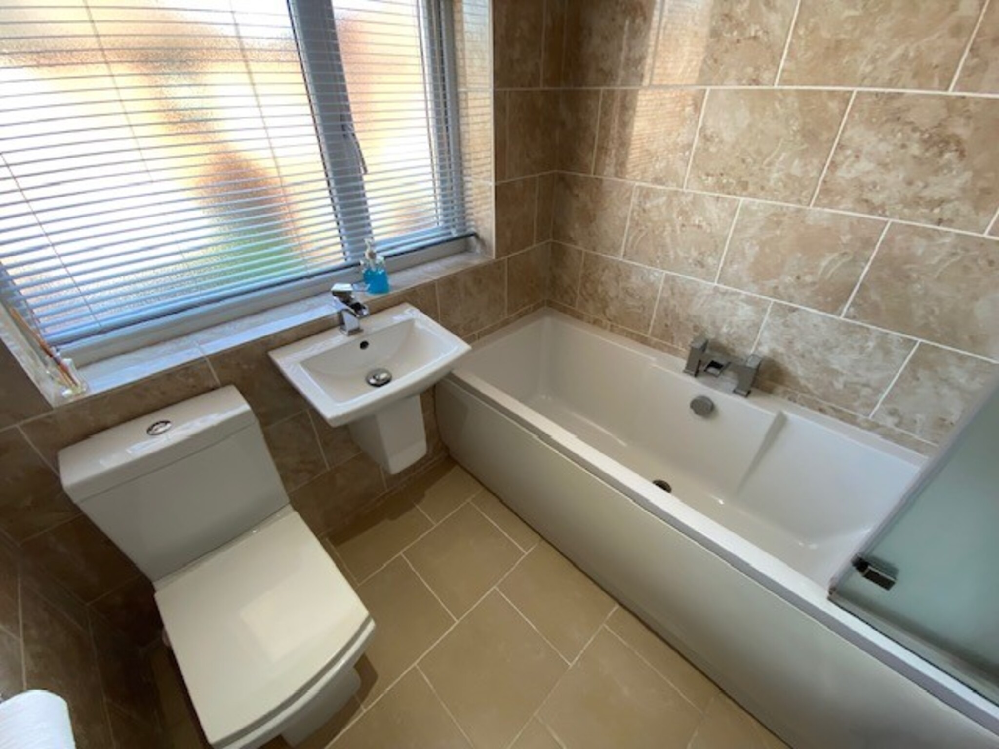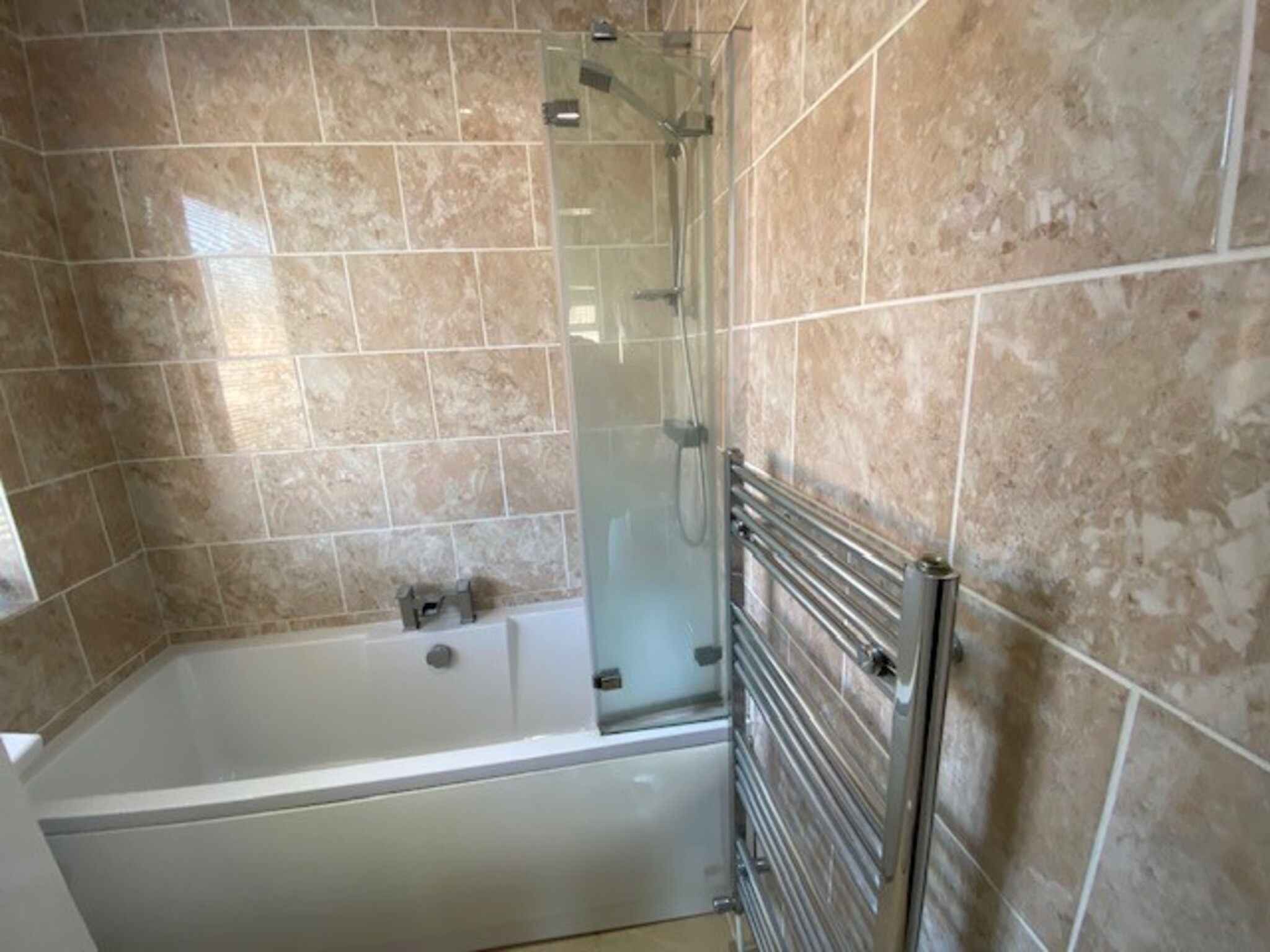 Low level flush suite, with mixer shower and glass shower screen, tiled walls, tiled flooring, chrome towel radiator