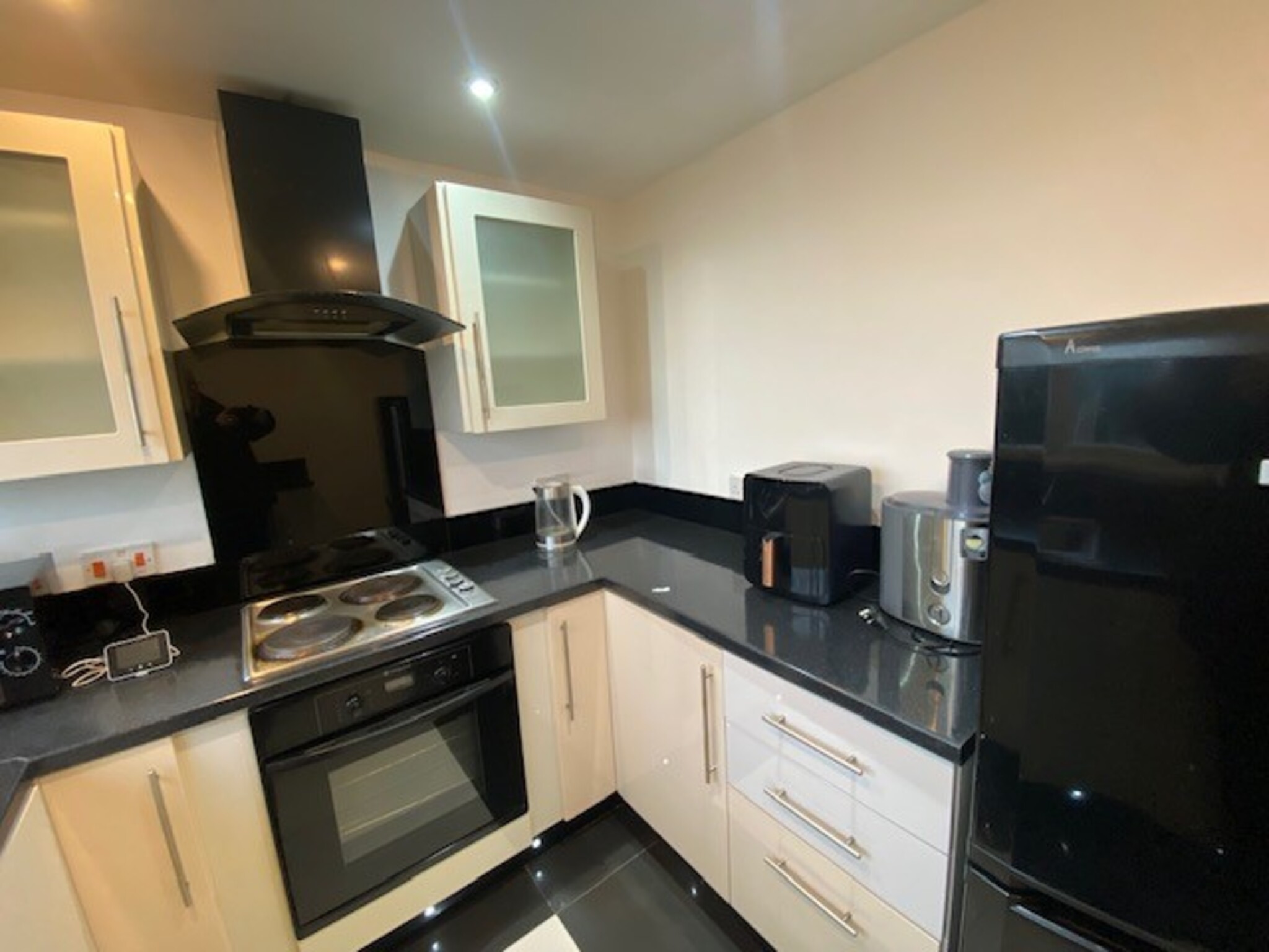 Range of fitted white high gloss base and wall units with plinth lights, stainless steel sink, electric hob and oven with extractor fan, integrated dishwasher, spotlights to ceiling, tiled floor.
