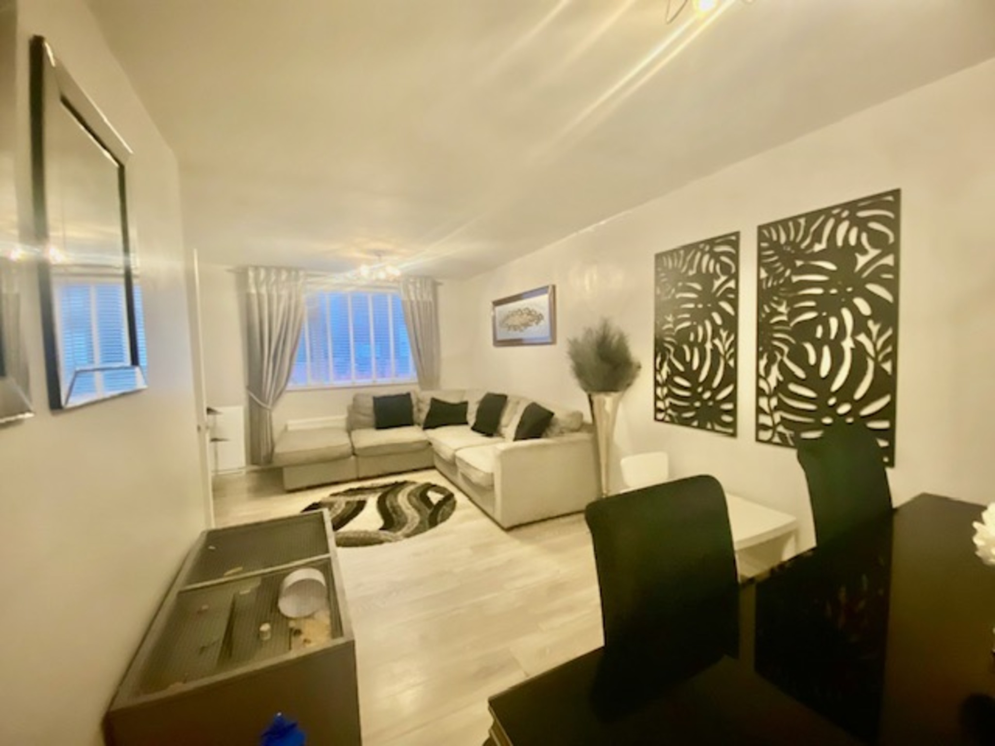 Radiator, blinds, laminate flooring,