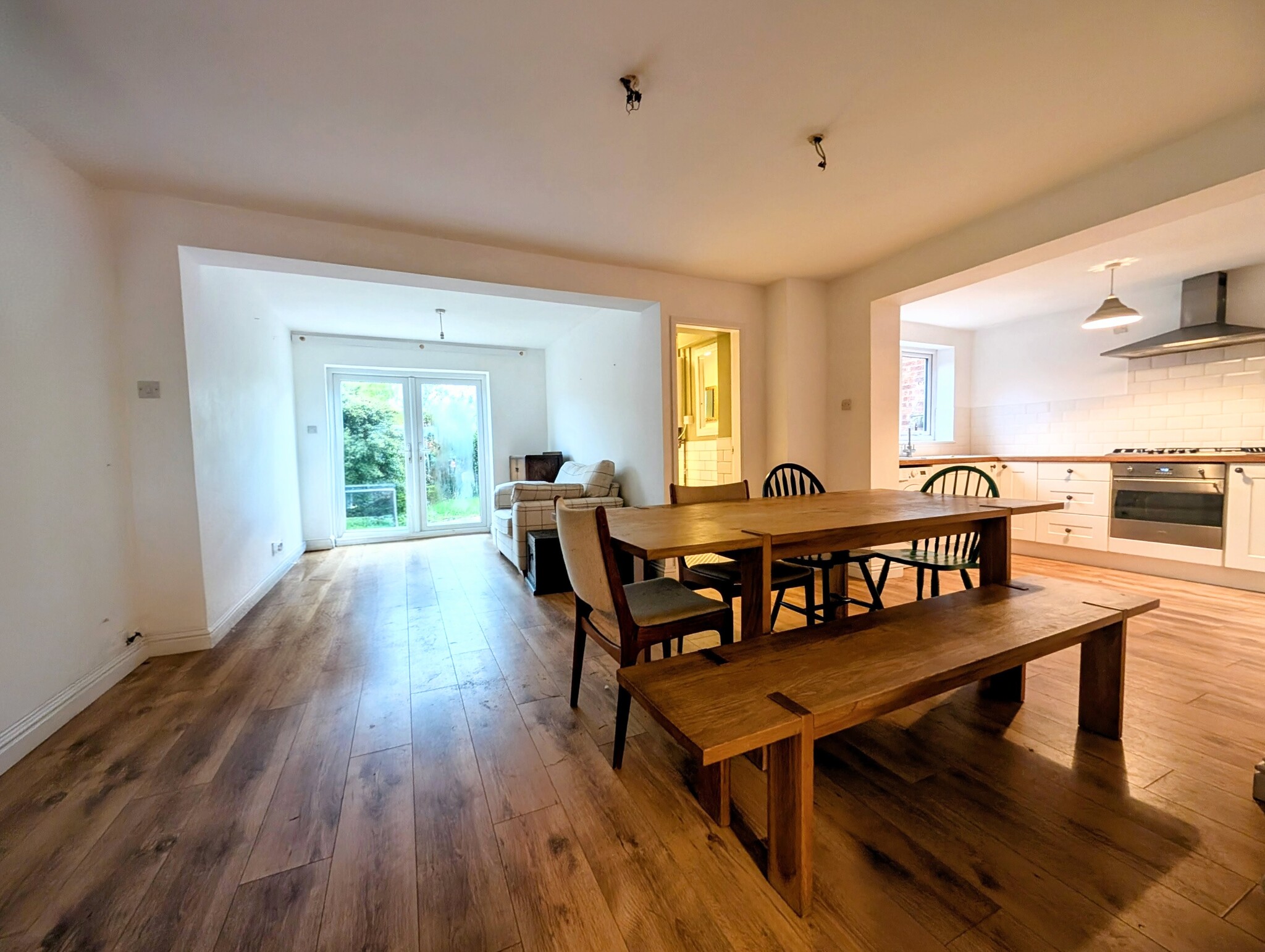 Laminate flooring, radiator Patio Doors leading to the garden