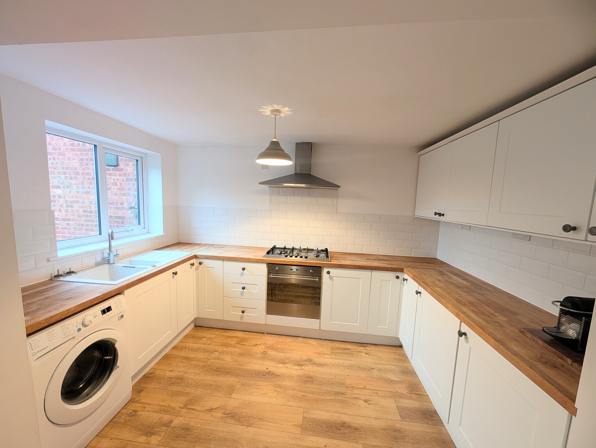 Range of fitted wall and base units with gas hob, electric oven, extractor fan, part tiled walls, laminate flooring,
