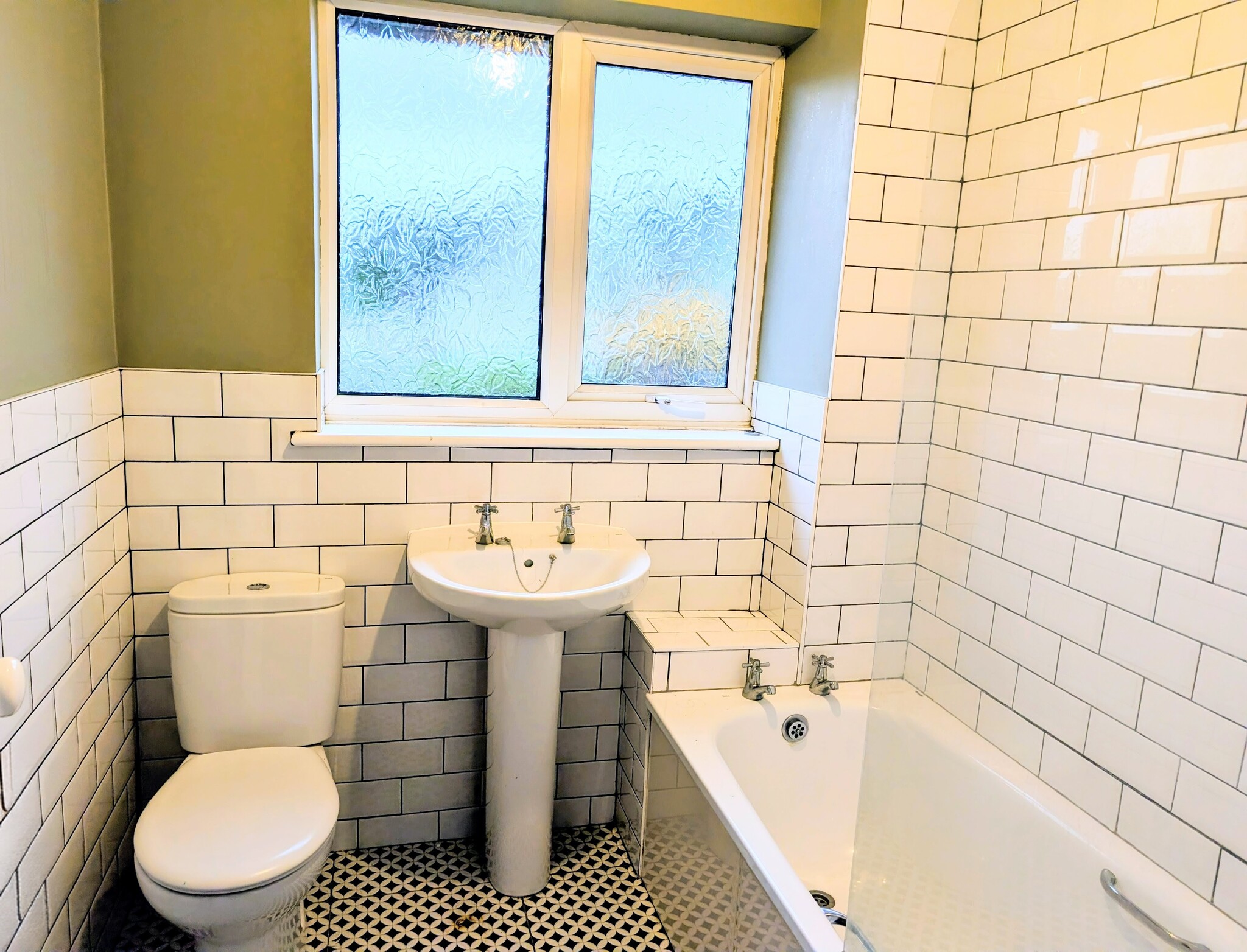 Low level flush suite with mixer shower and shower screen, part tiled walls, tiled flooring radiator