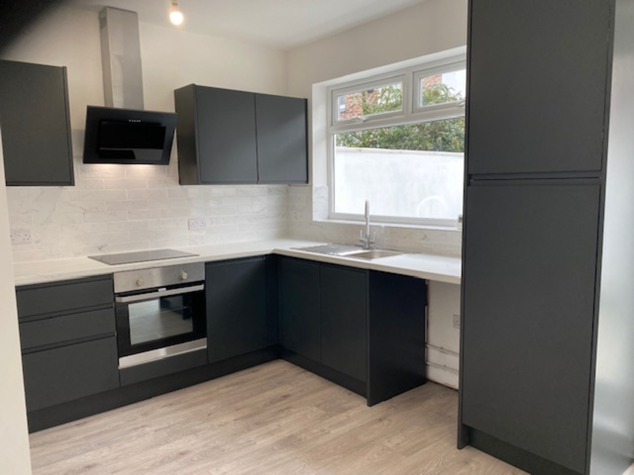 Fitted base and wall units with induction hob and electric oven with extractor fan, part tiled walls. laminate flooring