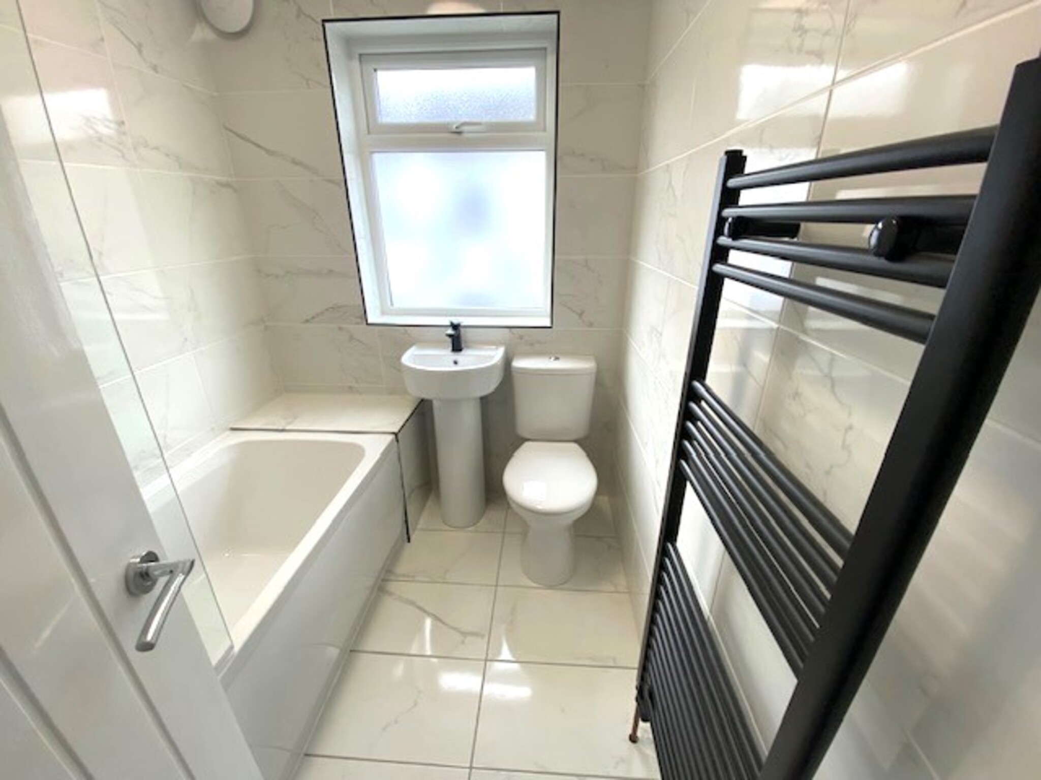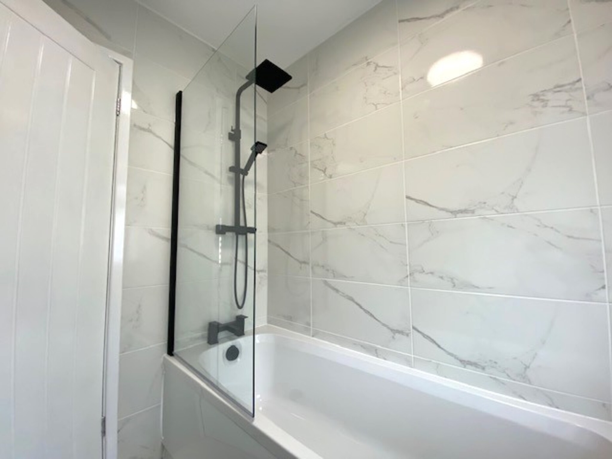 White suite with over bath mixer shower and screen, towel radiator, spotlights to ceiling, fully tiled.