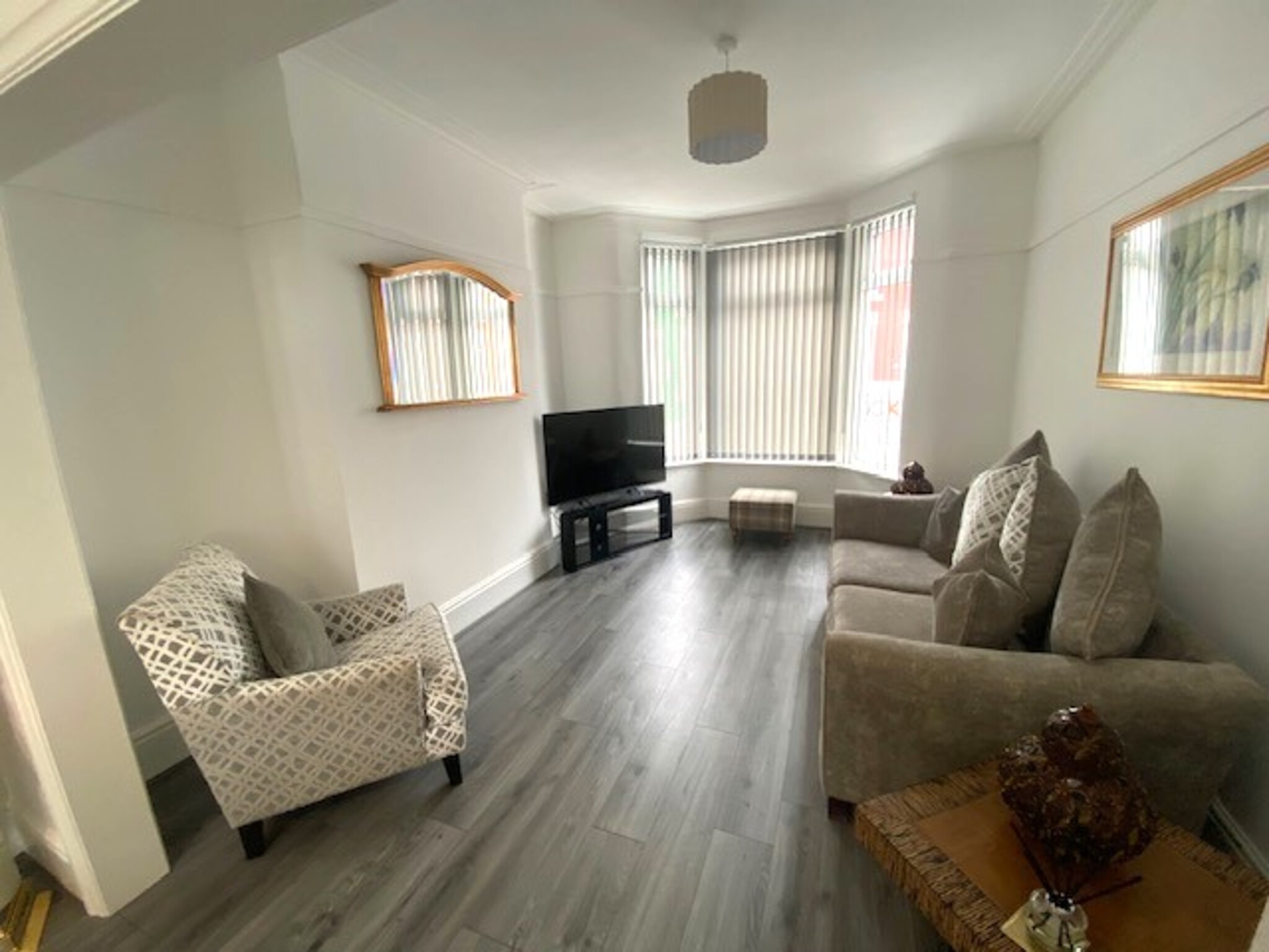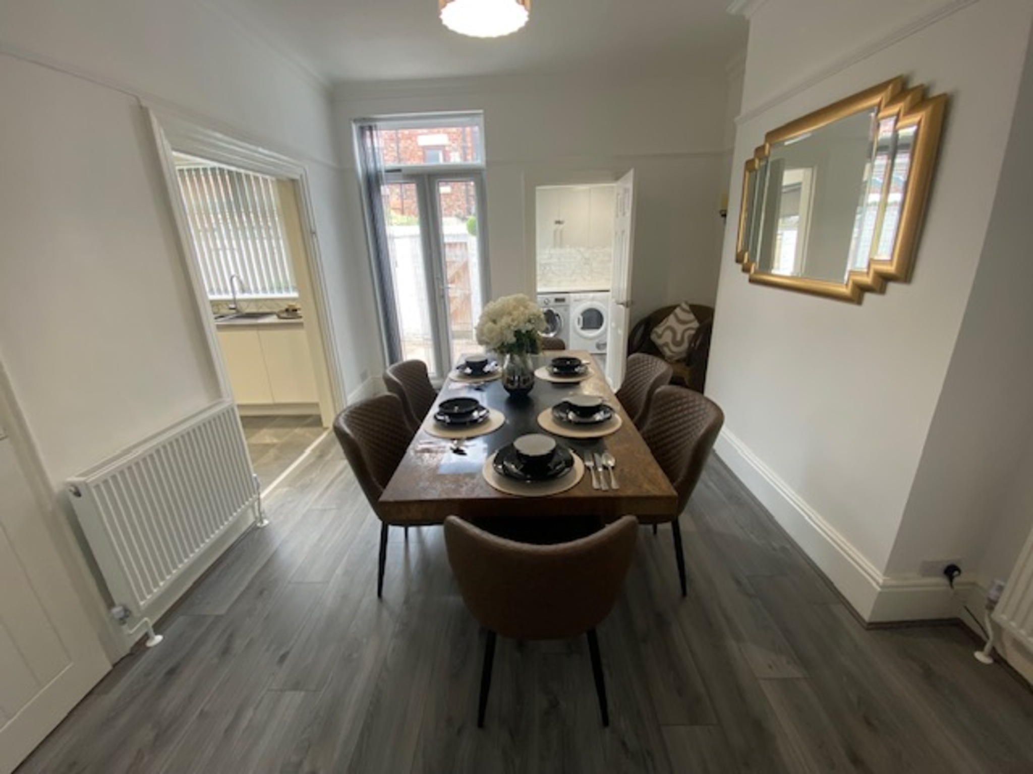Radiator, blinds, laminate flooring, French doors leading to rear yard. Open plan to kitchen.