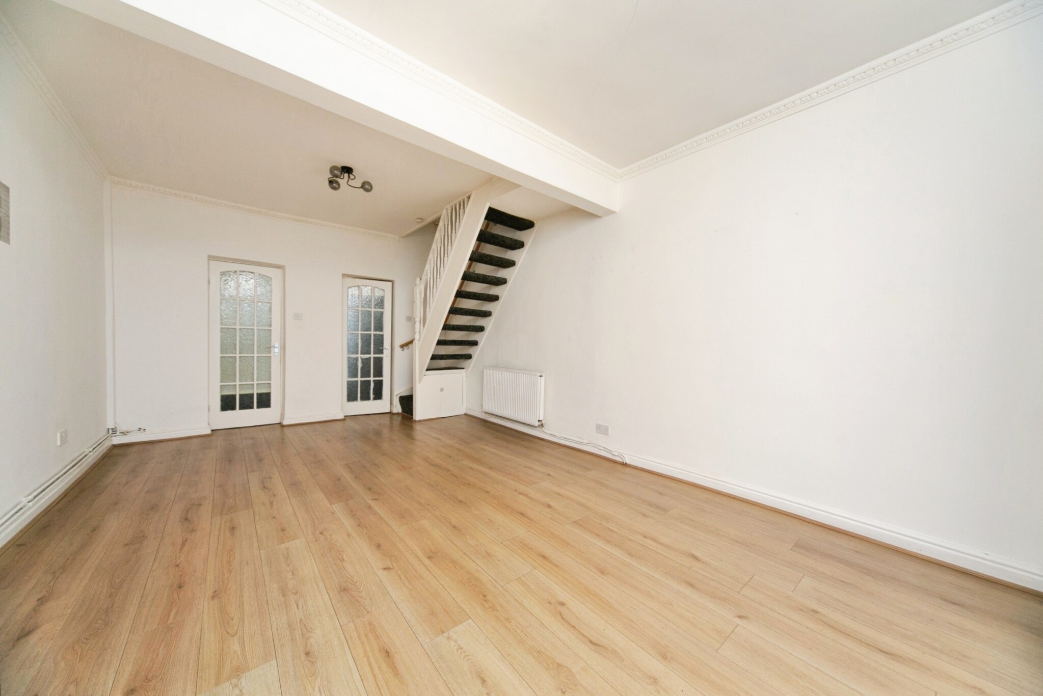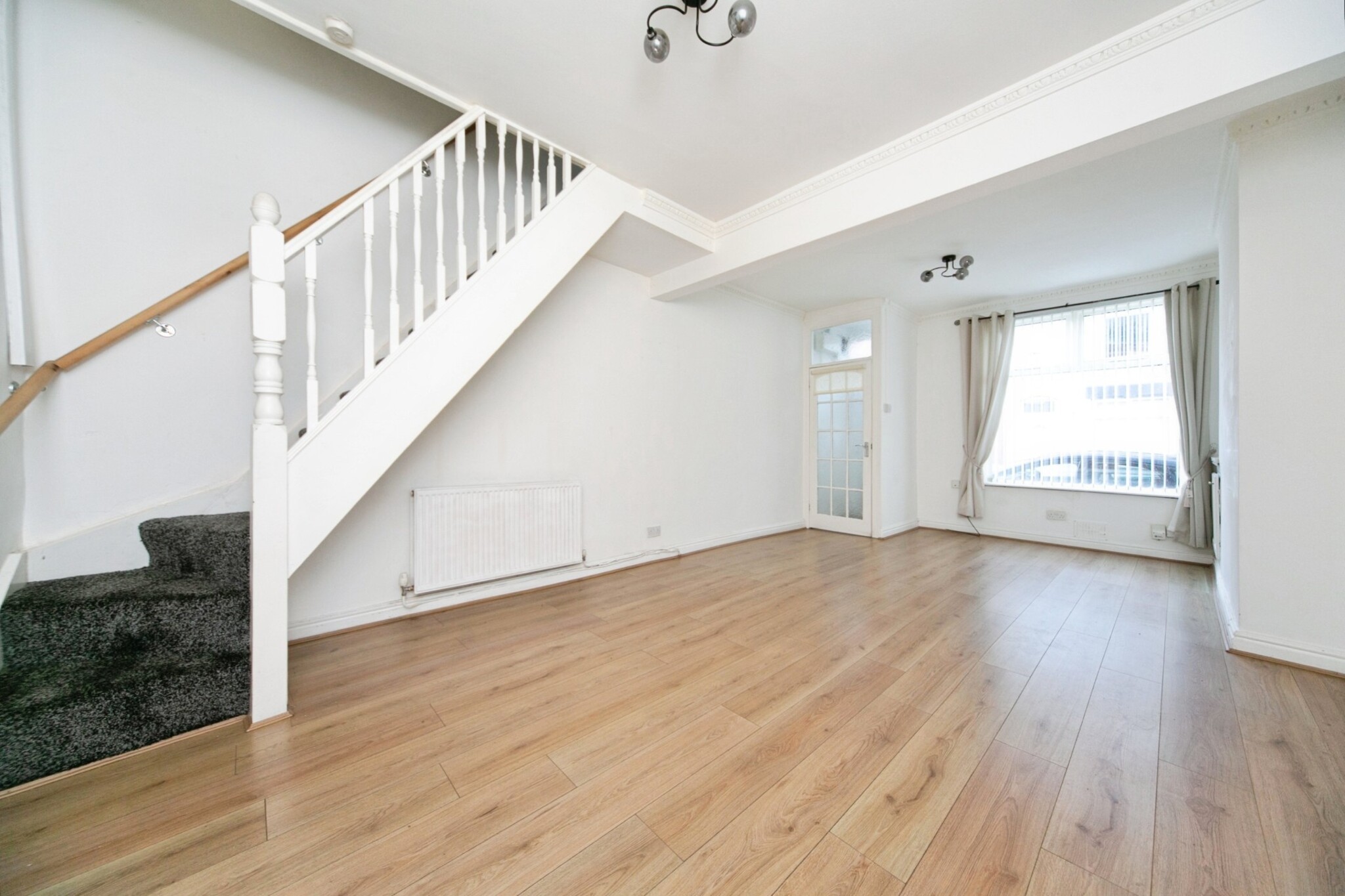 Radiator, blinds, laminate flooring, stairs with carpet to first floor.