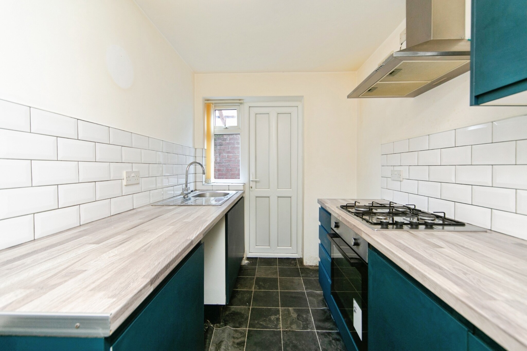 Fitted base and wall units with gas hob and electric oven with extractor fan, part tiled walls, blinds, vinyl flooring.