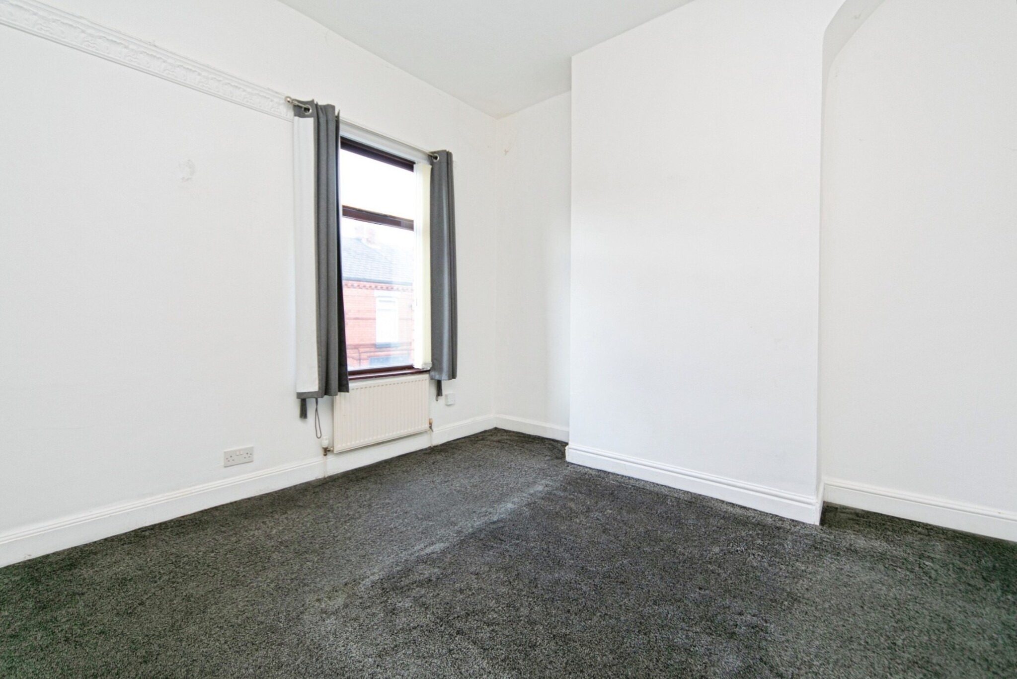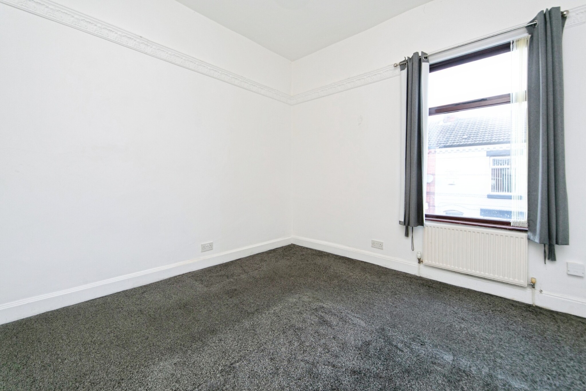 Radiator, blinds, carpet.