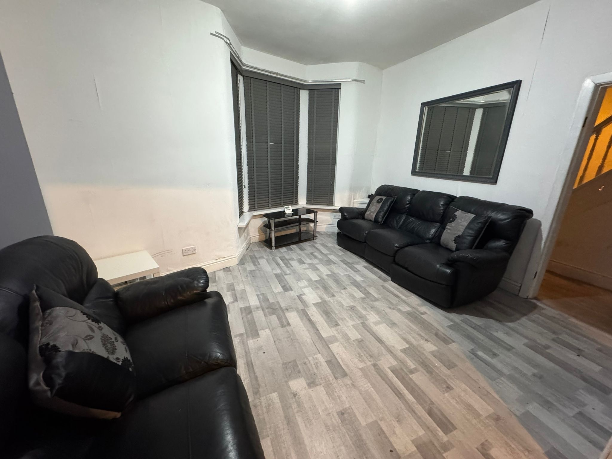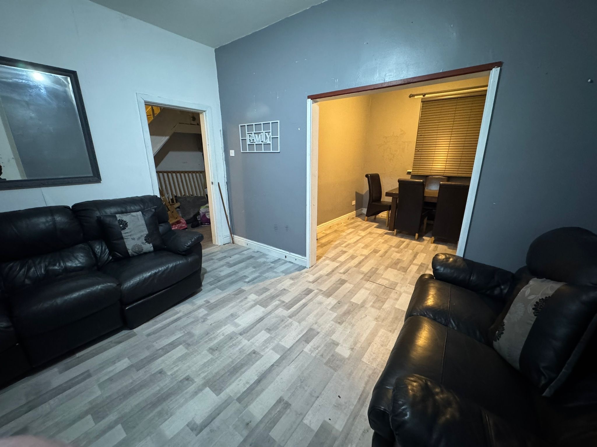 Range of wall and base units with 1 ½ sink and drainer, laminate flooring.