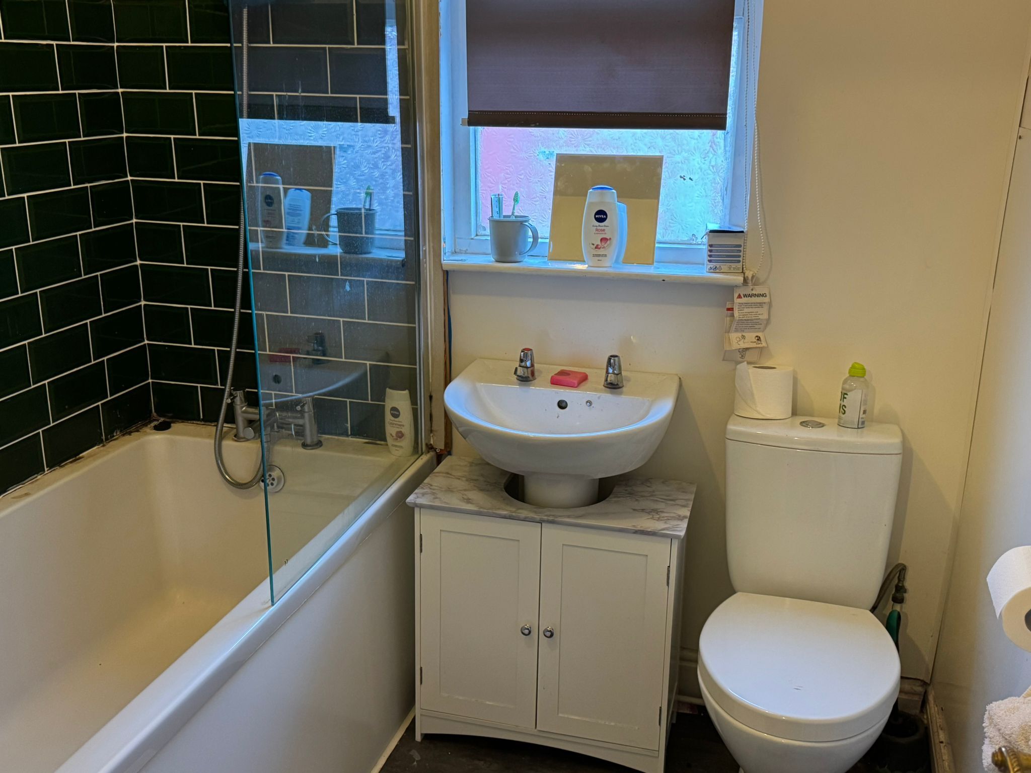 Low level flush suite with vanity unit, radiator, part tiled walls, vinyl flooring