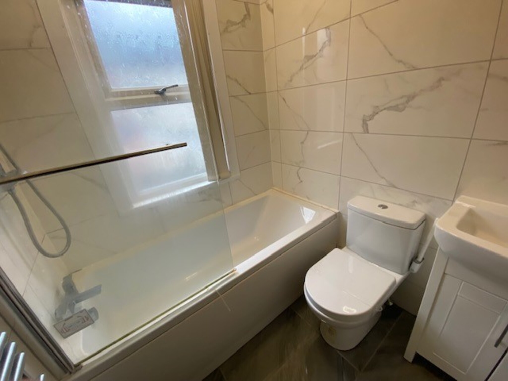White flush suite with wash basin in storage vanity unit, radiator, blinds, tiled walls and floor.